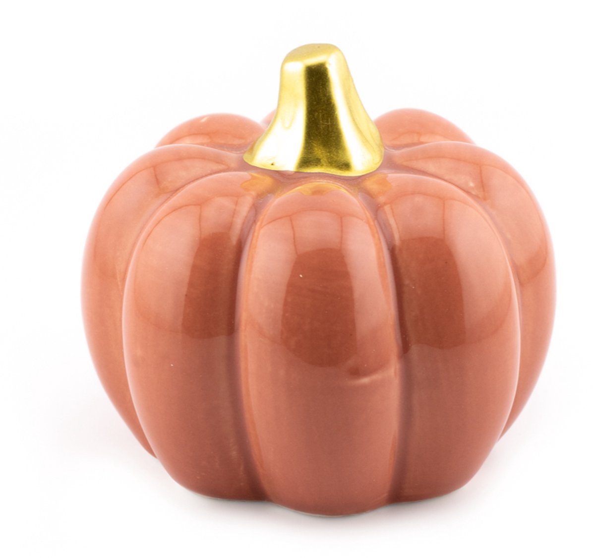 Deze compacte keramieken pompoen in een warme terracotta tint brengt direct sfeer in huis. De rijke kleur en de glanzende gouden steel geven hem een luxe en toch uitnodigende uitstraling, perfect voor het creëren van een knusse herfstsfeer.